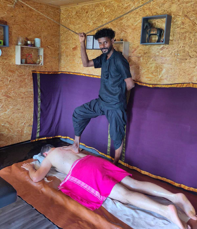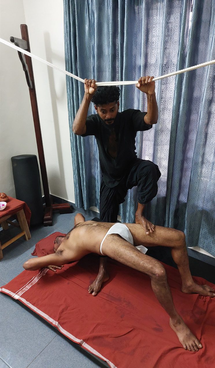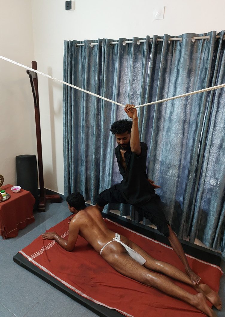 Again, treatments begin with a head massage, then the application of medicinal oil to the body, followed by a body massage done using the feet. After this, movements are done to awaken the ida and piṅgala and suṣumnā nāḍī energy channels.