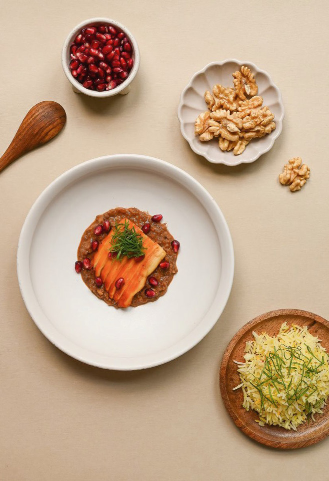 FESENJĀN WITH ‘CHICKEN OF THE WOODS MUSHROOMS’, POMEGRANATE, AND WALNUT